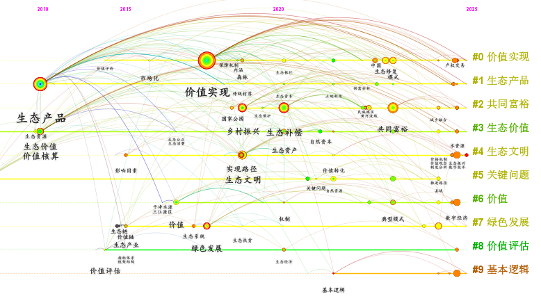 圖1 生態(tài)產(chǎn)品價(jià)值實(shí)現(xiàn)領(lǐng)域關(guān)鍵詞聚類時(shí)間線圖譜