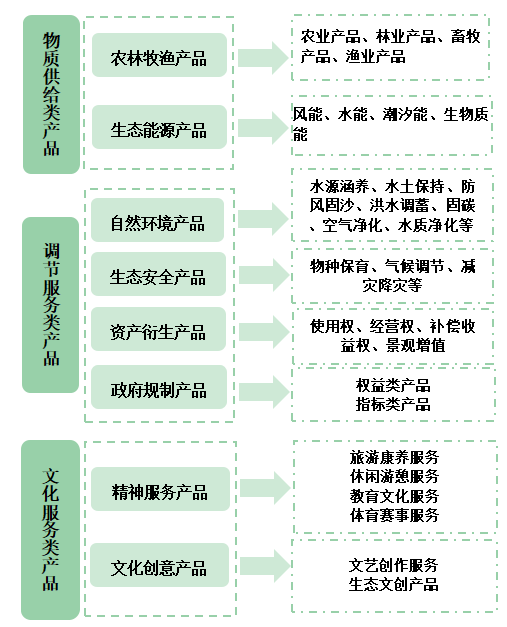物質(zhì)供給類產(chǎn)品是指生態(tài)系統(tǒng)為人類提供的各種有形的物質(zhì)產(chǎn)品,還可分為直接利用供給生態(tài)產(chǎn)品(農(nóng)林牧漁產(chǎn)品)和轉(zhuǎn)化利用供給生態(tài)產(chǎn)品(生態(tài)能源產(chǎn)品);調(diào)節(jié)服務(wù)類產(chǎn)品是指生態(tài)系統(tǒng)通過其自身的生態(tài)過程對(duì)環(huán)境起到調(diào)節(jié)作用而產(chǎn)生的無形產(chǎn)品,包括自然生態(tài)服務(wù)產(chǎn)品、生態(tài)安全產(chǎn)品、資產(chǎn)衍生產(chǎn)品和政府規(guī)制產(chǎn)品。其中,自然生態(tài)服務(wù)產(chǎn)品主要包括水源涵養(yǎng)、水土保持、防風(fēng)固沙、海岸線防護(hù)、洪水調(diào)蓄、固碳、空氣凈化、水質(zhì)凈化等;生態(tài)安全產(chǎn)品包括物種保育、氣候調(diào)節(jié)、減災(zāi)降災(zāi)等;資產(chǎn)衍生產(chǎn)品是由生態(tài)資源要素所有權(quán)衍生出的、具有明確產(chǎn)權(quán)的生態(tài)產(chǎn)品,政府規(guī)制產(chǎn)品是通過政府管控手段創(chuàng)造特定交易需求而形成的權(quán)益或指標(biāo)類生態(tài)產(chǎn)品,其中權(quán)益類產(chǎn)品主要包括碳排放配額、碳普惠、碳匯產(chǎn)品、排污權(quán)、用能權(quán)、取水權(quán)等,指標(biāo)類產(chǎn)品包括綠化增量責(zé)任指標(biāo)、森林覆蓋率考核指標(biāo)、森林單位蓄積增量指標(biāo)、清水增量責(zé)任指標(biāo)、海岸線占補(bǔ)平衡指標(biāo)、生態(tài)積分、水質(zhì)信用、地票等。文化服務(wù)類產(chǎn)品指生態(tài)系統(tǒng)為人類提供的具有文化、精神和娛樂價(jià)值的產(chǎn)品和服務(wù),主要包括精神服務(wù)產(chǎn)品和文化創(chuàng)意產(chǎn)品,其中,精神服務(wù)產(chǎn)品包括旅游康養(yǎng)、休閑游憩、教育文化、體育賽事等,文化創(chuàng)意產(chǎn)品包括文藝創(chuàng)作服務(wù)和生態(tài)文創(chuàng)產(chǎn)品等。