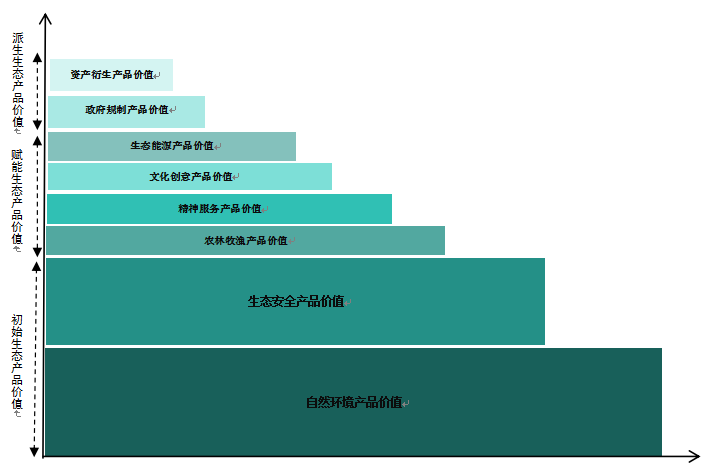 通過分析,本文認(rèn)為生態(tài)產(chǎn)品價(jià)值可以理解為初始生態(tài)產(chǎn)品價(jià)值、賦能生態(tài)產(chǎn)品價(jià)值、派生生態(tài)產(chǎn)品價(jià)值,且生態(tài)產(chǎn)品價(jià)值的構(gòu)成比例呈現(xiàn)階梯型分布特征(圖3)。初始生態(tài)產(chǎn)品價(jià)值是指生態(tài)系統(tǒng)最基礎(chǔ)、最核心的價(jià)值,是其他所有價(jià)值衍生的源頭,主要包括生態(tài)安全產(chǎn)品價(jià)值、自然環(huán)境產(chǎn)品價(jià)值;賦能生態(tài)產(chǎn)品價(jià)值是指在初始生態(tài)產(chǎn)品價(jià)值基礎(chǔ)上,通過適度的人工勞動(dòng)、技術(shù)投入、管理優(yōu)化或品牌建設(shè)等手段,對(duì)初始生態(tài)產(chǎn)品進(jìn)行品質(zhì)提升、功能拓展、效率提高,將其轉(zhuǎn)化為可直接滿足人類物質(zhì)和精神需求的、更具市場(chǎng)交易屬性的產(chǎn)品或服務(wù),主要包括農(nóng)林牧漁產(chǎn)品價(jià)值、精神服務(wù)產(chǎn)品價(jià)值、文化創(chuàng)意產(chǎn)品價(jià)值、生態(tài)能源產(chǎn)品價(jià)值等;派生生態(tài)產(chǎn)品價(jià)值是指在初始產(chǎn)品和賦能產(chǎn)品價(jià)值的基礎(chǔ)上,通過制度設(shè)計(jì)、金融創(chuàng)新以及市場(chǎng)機(jī)制所衍生的,代表生態(tài)價(jià)值產(chǎn)權(quán)或政策目標(biāo)的抽象化、金融化或規(guī)制性價(jià)值,主要包括資產(chǎn)衍生產(chǎn)品價(jià)值、政府規(guī)制產(chǎn)品價(jià)值等。