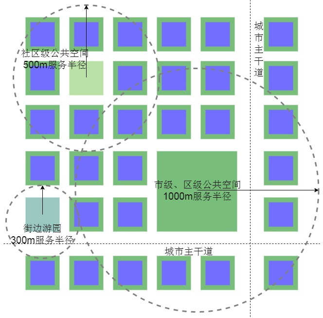 凱文·林奇認為,在城市廣場中親切的尺寸是12米,而宜人的尺寸是24米;在《如何營造一個有吸引力的城市》中指出廣場的直徑應該控制在30米,超過這個尺寸會使得廣場上的人和物變得渺小、疏遠。在城市街道中一般最長距離的紀念性空間,也不會超過1.5公里,在這個尺度內,使用者會擁有一定的尺度感、歸屬感。不同尺度的公共空間的服務半徑也不盡相同,這就形成了豐富的公共空間系統(tǒng)。