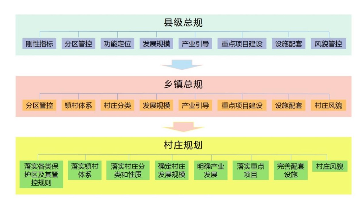鄉(xiāng)鎮(zhèn)國土空間總體規(guī)劃在分區(qū)管控、村莊分類和定位、鎮(zhèn)村體系、發(fā)展規(guī)模、產(chǎn)業(yè)引導(dǎo)、設(shè)施配套、重點項目建設(shè)、村莊風(fēng)貌等方面對村莊規(guī)劃進行傳導(dǎo)。