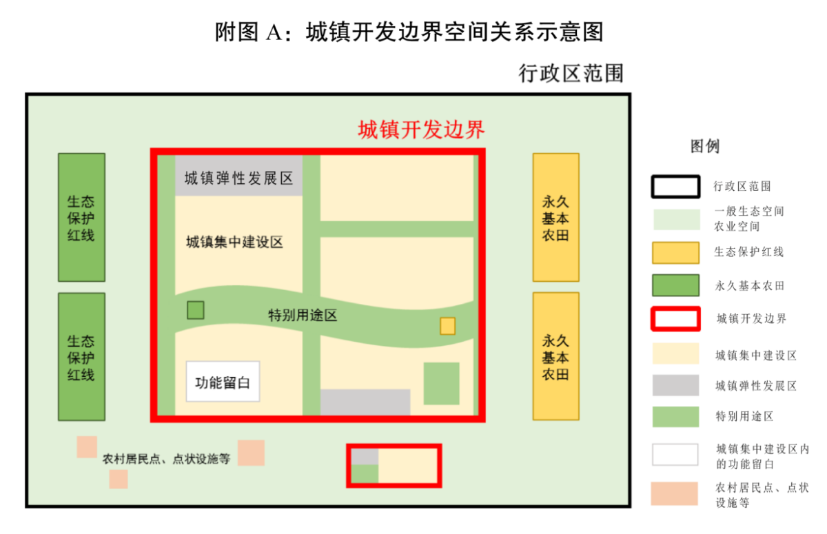 城鎮(zhèn)開發(fā)邊界是在國土空間規(guī)劃中劃定的,一定時期內因城鎮(zhèn)發(fā)展需要,可以集中進行城鎮(zhèn)開發(fā)建設,完善城鎮(zhèn)功能、提升空間品質的區(qū)域邊界,涉及城市、建制鎮(zhèn)以及各類開發(fā)區(qū)等。城鎮(zhèn)開發(fā)邊界內可分為城鎮(zhèn)集中建設區(qū)、城鎮(zhèn)彈性發(fā)展區(qū)和特別用途區(qū)(空間關系詳見圖A)。城市、建制鎮(zhèn)應劃定城鎮(zhèn)開發(fā)邊界。