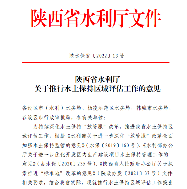 陜西省水利廳印發(fā)了《陜西省水利廳關(guān)于推行水土保持區(qū)域評估工作的意見》(陜水保發(fā)〔2022〕13號),強(qiáng)調(diào)持續(xù)深化水土保持“放管服”改革,推進(jìn)陜西省水土保持區(qū)域評估工作。