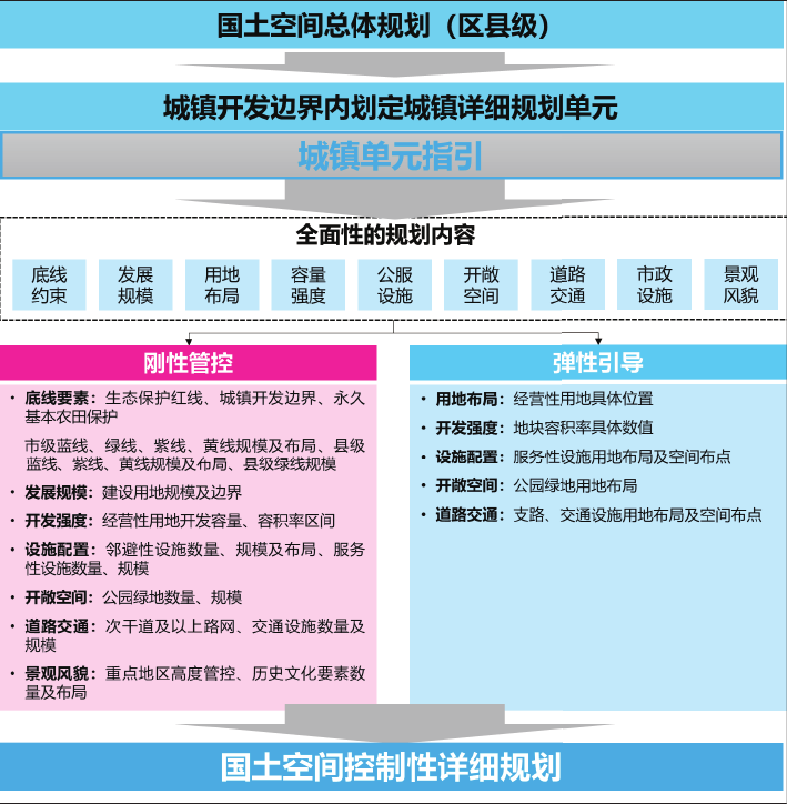針對于區(qū)、縣整體規(guī)劃要求,強調(diào)底線控制,按照“總體控制、總量控制、重點控制”的原則,以傳導(dǎo)落實總規(guī)剛性管控內(nèi)容為主,圍繞發(fā)展規(guī)模、公益性事項兩大類要素,進行總量的分解。根據(jù)街道、片區(qū)、甚至山水界限來劃分,要求體現(xiàn)管理的核心。單元層次詳細(xì)規(guī)劃是片區(qū)詳細(xì)規(guī)劃的延續(xù)與深化,應(yīng)將管控要求落實到具體地塊,作為建設(shè)項目規(guī)劃行政許可的直接依據(jù)。其規(guī)模控制、底線的規(guī)定、用地的規(guī)劃等要根據(jù)總體規(guī)劃來制定,并進行詳細(xì)的規(guī)劃,強調(diào)地塊彈性控制,適當(dāng)?shù)牧粲杏嗟?,?xì)化詳細(xì)規(guī)劃編制控制內(nèi)容。并著重“剛性傳導(dǎo)、彈性適應(yīng)”,確保分解落實,如下圖1展示。