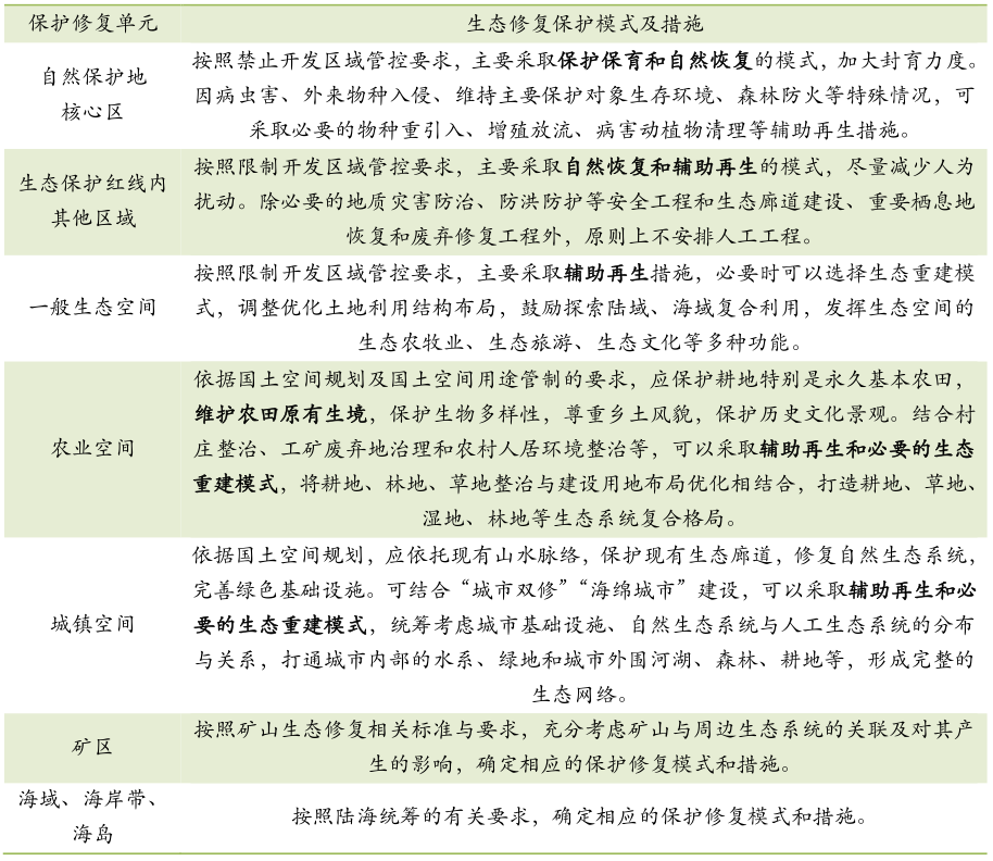 在保護(hù)修復(fù)單元內(nèi),根據(jù)現(xiàn)狀調(diào)查、生態(tài)問(wèn)題識(shí)別與診斷結(jié)果、生態(tài)保護(hù)修復(fù)目標(biāo)及標(biāo)準(zhǔn)等,遵循“自然修復(fù)為主、人工修復(fù)為輔”的原則,確定各類型生態(tài)保護(hù)修復(fù)單元的保護(hù)修復(fù)技術(shù)模式。技術(shù)模式一般包括保護(hù)保育、自然恢復(fù)、輔助再生、生態(tài)重建等。一個(gè)生態(tài)保護(hù)修復(fù)單元內(nèi)可選擇一種或多種模式。