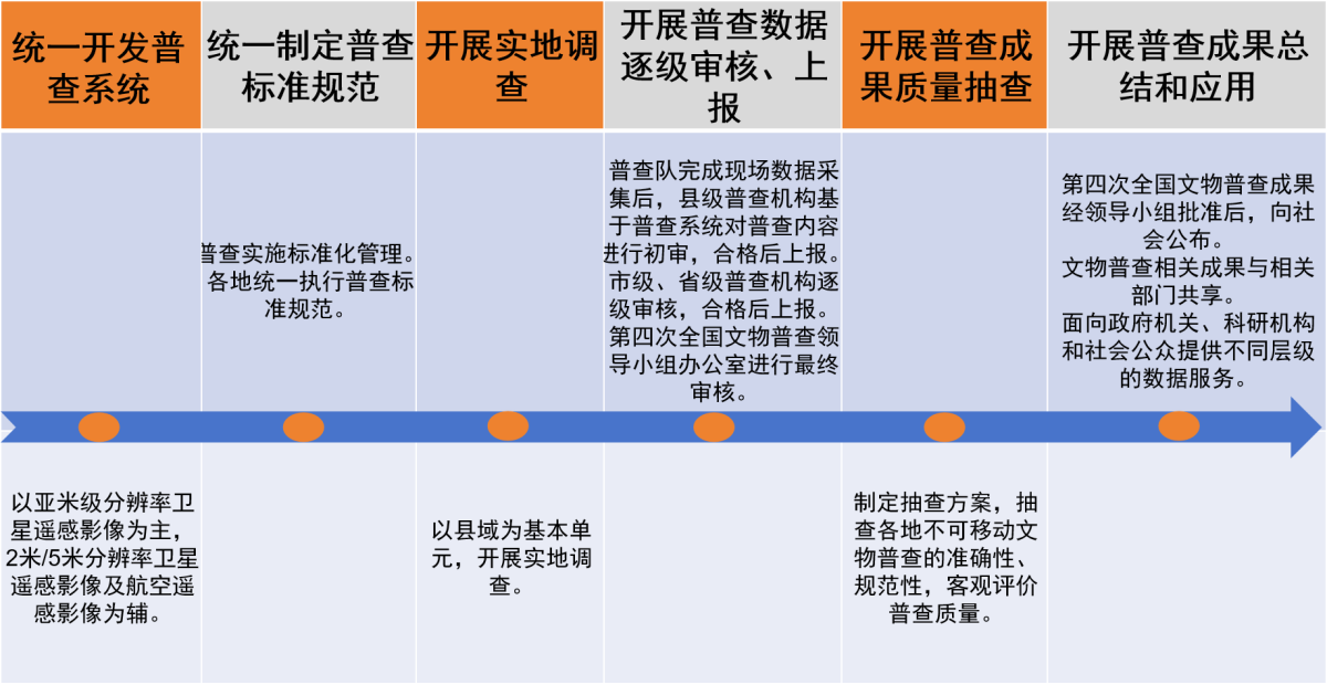 統(tǒng)一開發(fā)普查系統(tǒng),充分利用三普、各類文物資源專項調(diào)查等已有成果,合理應(yīng)用文物保護(hù)管理工作基礎(chǔ)和先進(jìn)技術(shù),采取國家整體控制和地方實地調(diào)查相結(jié)合的方法,準(zhǔn)確查清全國每一處不可移動文物基礎(chǔ)信息,經(jīng)縣級、市級、省級、國家逐級檢查合格后,匯總建立全國不可移動文物資源大數(shù)據(jù)庫,在此基礎(chǔ)上開展普查成果匯總分析等工作。
