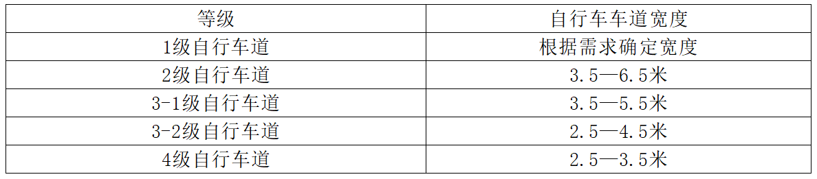 自行車道寬度是自行車通行的基本保證,一條自行車道的寬度應為一個成年人的橫向?qū)挾龋?/span>0.6m)加上自行車運行時兩側(cè)擺動值各0.2m,故一條自行車道的寬度應為1.0m。若有路緣石,其一側(cè)的0.25m路緣帶騎行者難以利用,因此需在車道總寬度中加上0.5m,即一條車道應為1.5m,兩條車道為2.5m。若取最小寬度1.5m時,騎行人會感到壓抑、拘束從而降低車行速度;而選擇太寬則容易被機動車占道行駛。因此,針對不同的自行車道等級,應給出不同的寬度建議。